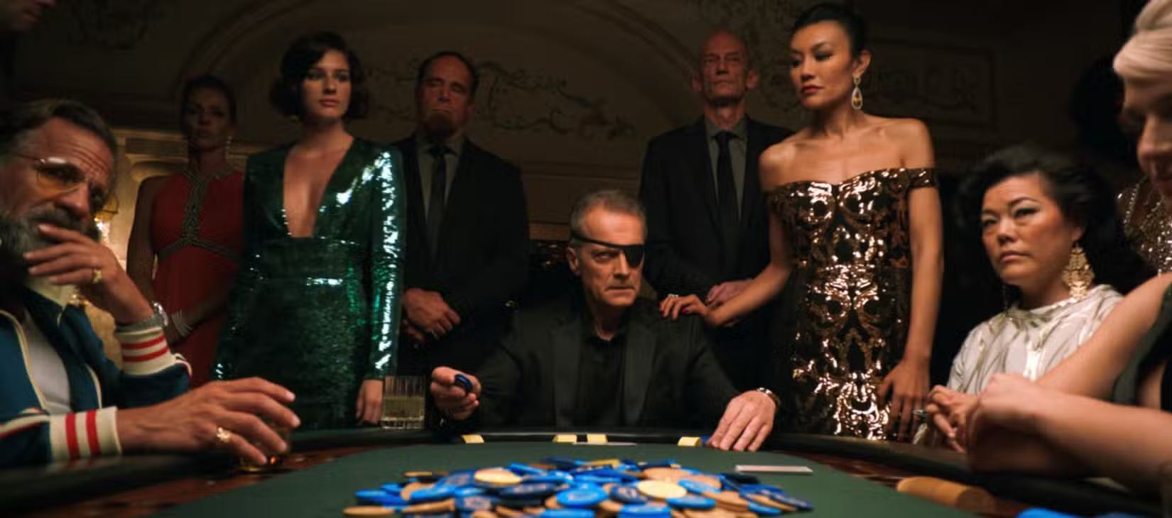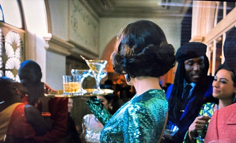 In Episode 6, as Carol is driving to Las Vegas, the show offers a glimpse of the Mauritanian Koumba Diabaté’s life in Elvis Presley’s suite at the top of the Westgate Hotel. A 90-second tracking shot (evoking the famous Copa shot from Martin Scorsese’s Goodfellas) follows a beautiful cocktail server in a green sequined dress threading her way through crowded rooms of glamorously dressed guests, laughing and chatting in French, some plucking drinks off her tray, until she reaches Koumba, sitting at a poker table across from a surly man in an eyepatch, where guests watch as if in a James Bond movie, as final bets are placed.