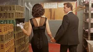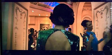 But the tracking shot was Gilligan’s choice (brought off by director Gandja Monteiro), not Koumba’s, designed to show how the dozens of joined participants were performing meticulously, remaining in character, making sophisticated cocktail talk with other “joined” individuals with perfect hair and attire well out of earshot of Koumba, as part of the background vibe of the suite. Scorsese’s shot is also very much about the service staff, as the young Henry Hill, accompanied by his fiancée, in evening dress (with hair exactly like the joined cocktail server), threads his way through the kitchens and service areas to the club dining room.