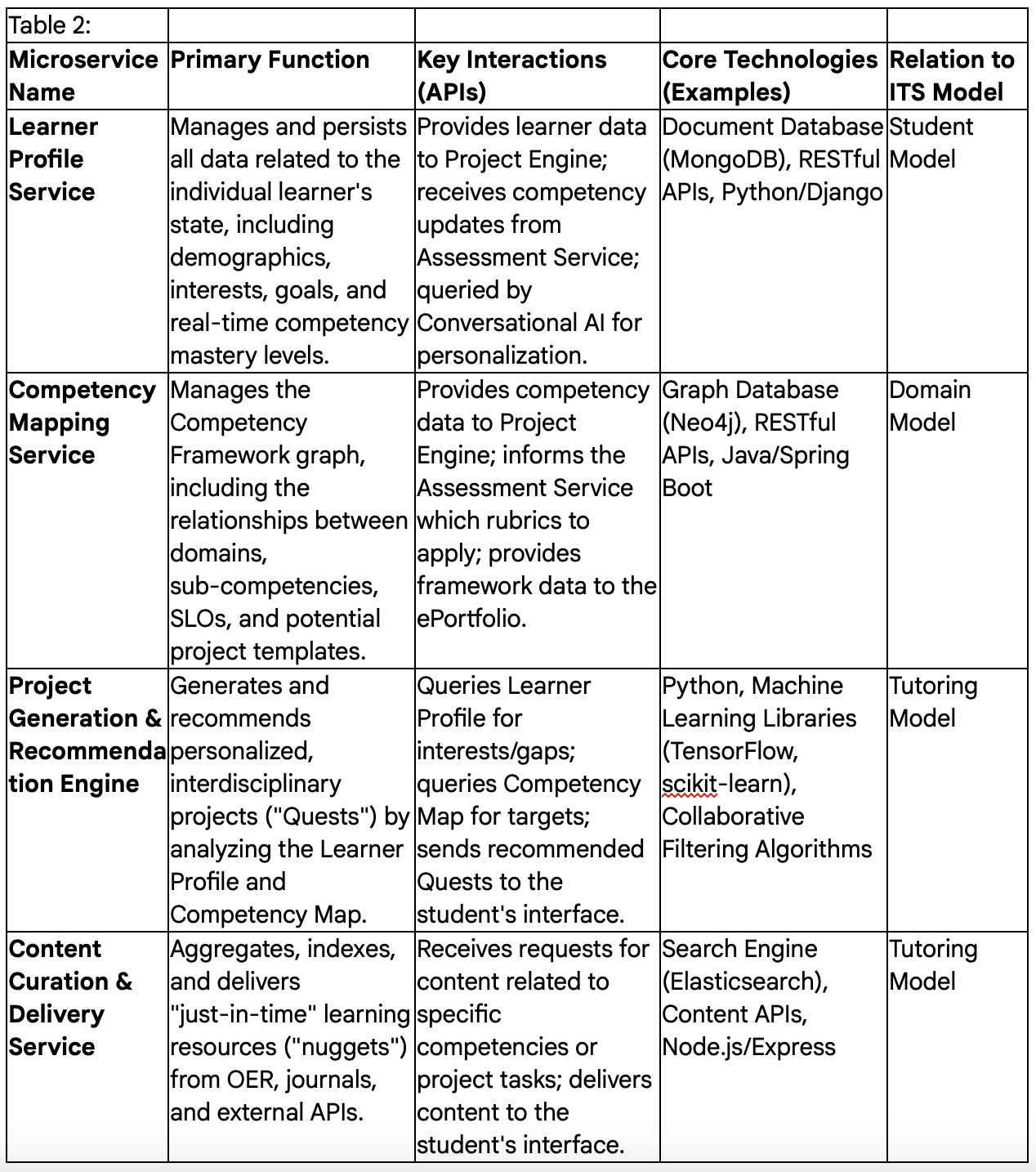Table 2: Microservices Architecture