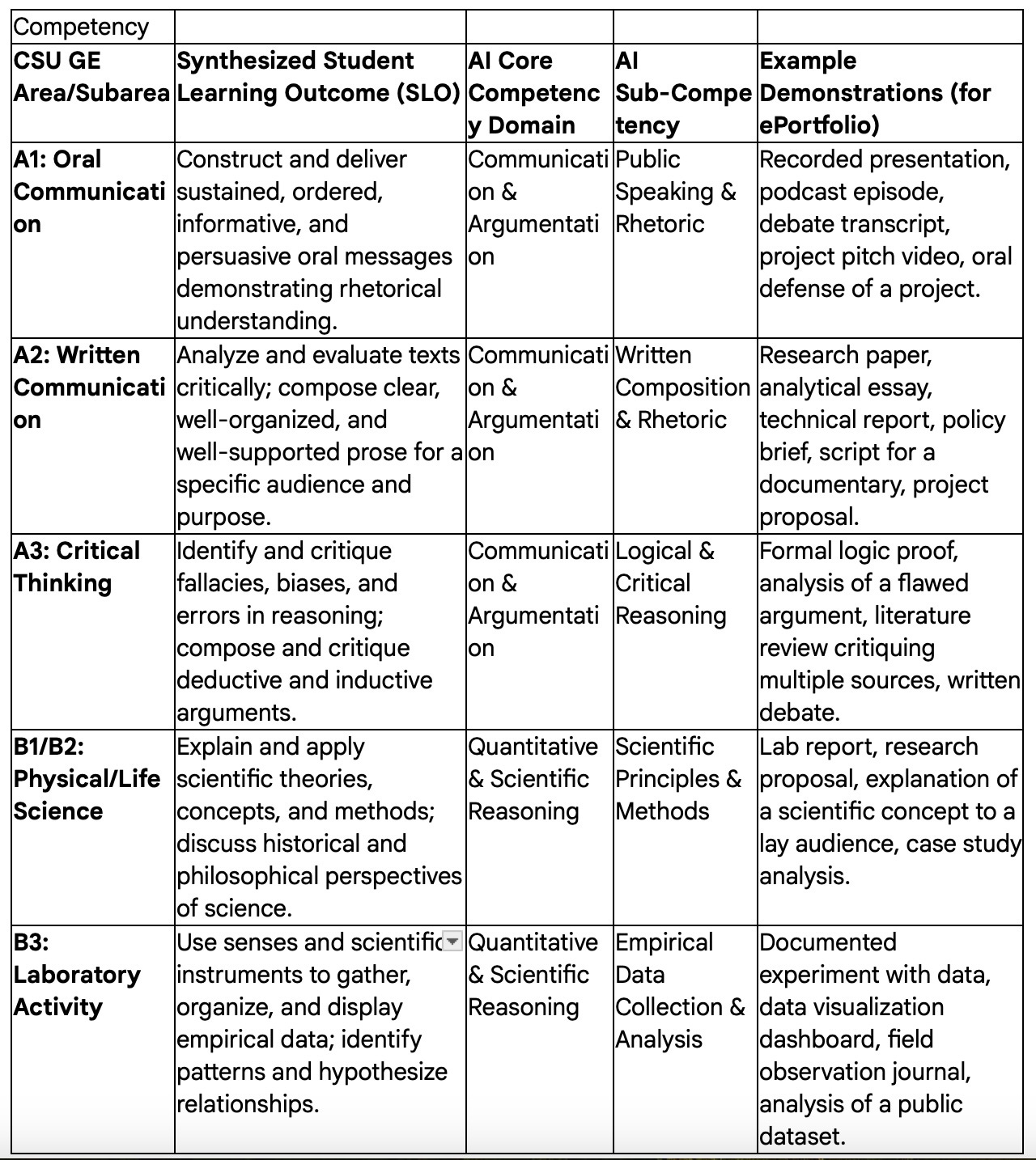 Extract Core Learning Outcomes: The system will synthesize the official Student Learning Outcomes (SLOs) published by various CSU campuses for each GE area. The goal is to move beyond course titles and identify the specific, demonstrable skills students are expected to acquire (e.g., “construct and deliver persuasive oral messages,” “apply the scientific method,” “analyze and interpret creative expression”).