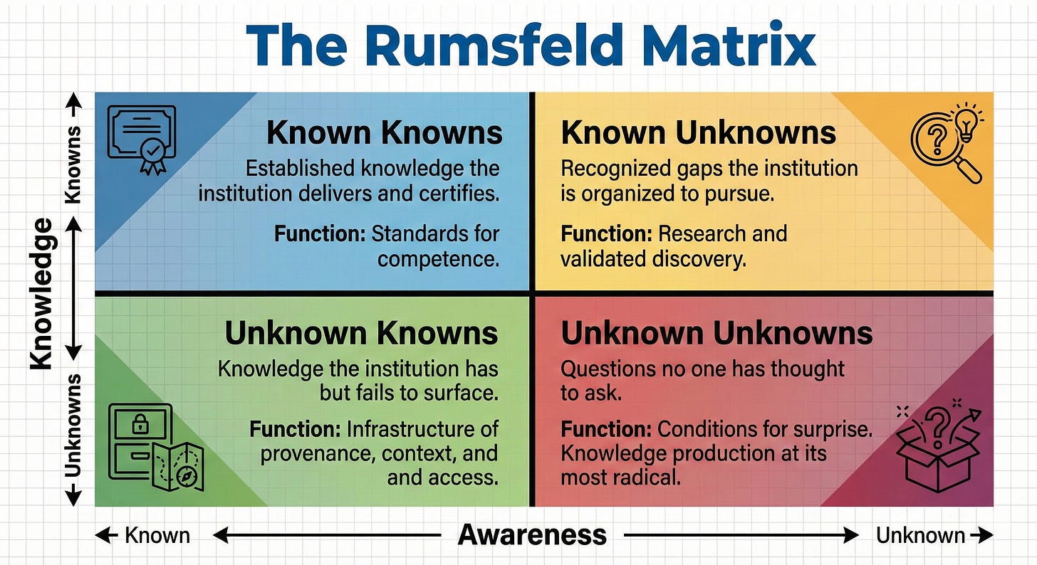 Unknown knowns, for a university, are largely internal. They are the university’s buried assets and underused capabilities.1 Knowledge may be unknown because it was never catalogued or exists in poor archives. Every university has datasets no one is currently maintaining. Departmental expertise and institutional memory are often invisible outside a narrow circle. Unspoken rules guide dissemination. A great deal of knowledge in the humanities (particularly history) is “known somewhere” yet unavailable in practice because it is gated, fragmented, untranslated, or lost in obscure venues. The library and archive function sits here, though the quadrant is larger than the library. “Unknown knowns” are knowledge the university could surface, connect, and make usable but regularly fails to.